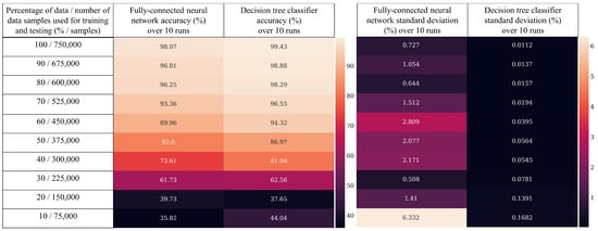Generally, neural networks require much more data than decision tree classifiers to make accurate predictions. In Figure 6, we see that, on average, the decision tree maintained 2–9% higher accuracy than the neural network when trained on iteratively smaller subsets of the full dataset. Also, the accuracies of the trained neural networks had a higher standard deviation than the trained decision tree accuracies (Figure 6). The training of an accurate neural network is partially dependent on the initial, randomly-set weights. Therefore, even with the same hyperparameters, like shape and size of the hidden layers, the accuracy can be very variable (Figure 6). As well as being more accurate, this shows that decision trees also tend to train more dependably.
