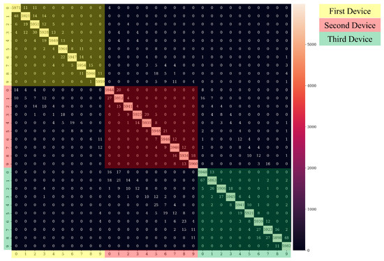 The confusion matrix corresponding to classification performed using a neural network trained on a dataset with 30-component output vectors. The data correspond to ten transmission eigenchannels of three devices with three different scattering strengths Ns. This classification allows for identification of both the eigenchannel as well as the disorder strength. The ports corresponding to the respective three devices are color coded. The maximum value in any cell can be 6000.