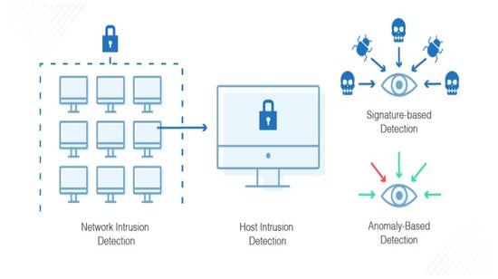 There are two types of IDS, based on signatures or anomalies, as shown in Figure 1. An IDS based on signatures identifies attacks using a huge database of known attack signatures. It can only detect known assaults and has no way of detecting novel ones. The IDS approach to anomaly detection creates a statistical model to characterize typical network flow. An anomaly is defined as network traffic that deviates from the model pattern, and such behavior is identified as an intrusion. An IDS is utilized to identify and categorize attacks or violations of security-related protocols at host- and network-level architecture. Depending on the invasive behavior, Intrusion Detection Systems are based on network or host. A network-based IDS (NIDS) is based on network activity. Network activity is gathered through network monitoring equipment such as switches, routers, and other network devices. A host-based IDS (HIDS) is utilized on local host computer activity. The HIDS operates with a variety of log files that are gathered by sensors from the local host computer. The NIDS monitors every packet in the network, whereas the HIDS relies on log files and user account information. The majority of companies utilize a combination of NIDS and HIDS.