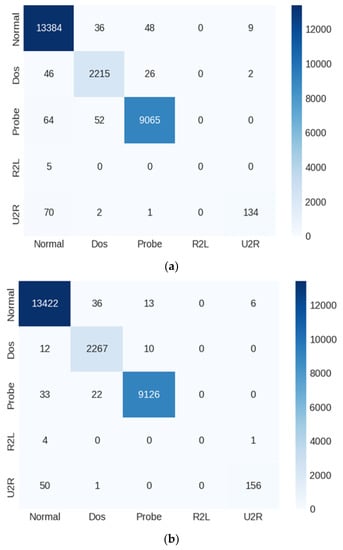 Classification models produce multiple category outputs. The overall error in our model is calculated by most error measures, but we cannot detect specific instances of faults in our model. The model may misclassify some categories more than others, but using a conventional accuracy metric, we cannot discern this. Figure 4a,b shows the confusion matrix of the NSL-KDD dataset for each CNN model (Custom CNN and CNN model with LSTM). The confusion matrix was divided into 5 × 5 matrices with five different classes. Table 5 shows the accuracy of the training and test datasets of both models.