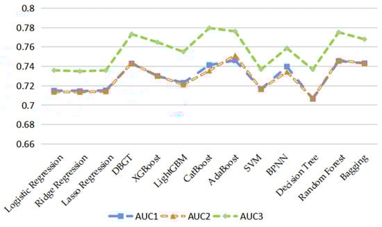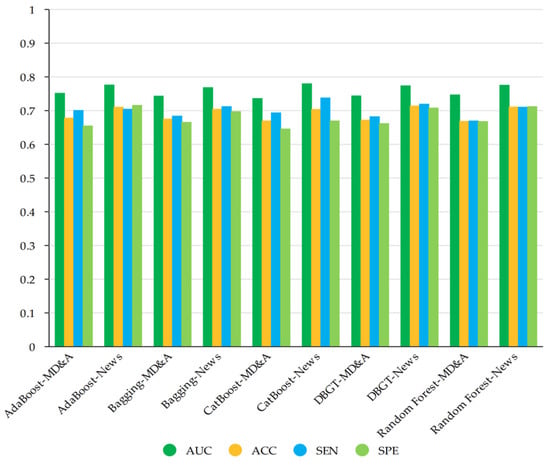 According to the results of the empirical analysis, it can be found that the introduction of the emotional tone of the MD&A does not provide more incremental information for the identification of financial crises of listed companies. However, it brings a certain amount of noise, which leads to a slight decrease in the overall mean value of AUC, ACC, SEN, and SPE. This is in line with some literature findings that management can manipulate and modify texts to increase the positive level of the emotional tone, which can be very disruptive to the early warning effect [,,]. It is clear that texts disclosed internally by firms are vulnerable to manipulation by management. This paper further investigates external texts that are difficult for companies to influence, such as financial news texts. The introduction of the emotional tone indicator of financial news to the machine learning model results in a better early warning effect than that of MD&A, which provides a new research idea for financial crisis early warning models from the perspective of feature engineering. On the early warning effects of thirteen machine learning models, DBGT, AdaBoost, random forest and Bagging all have good prediction performance on all three sets of input feature variables, providing an empirical basis for following research and applications.