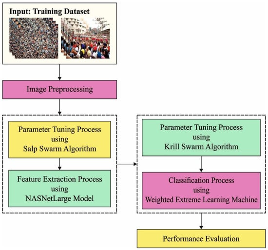 In this study, a new MDTL-ICDDC technique was established for effectual identification and classification of crowd density on a video surveillance system. The MDTL-ICDDC model initially presented an SSA with NASNetLarge model as a feature extraction model in which the hyperparameter tuning process is performed by the SSA. This was followed by the KSA-WELM model, which is employed for crowd-density and classification processes. Figure 1 illustrates the block diagram of MDTL-ICDDC technique.