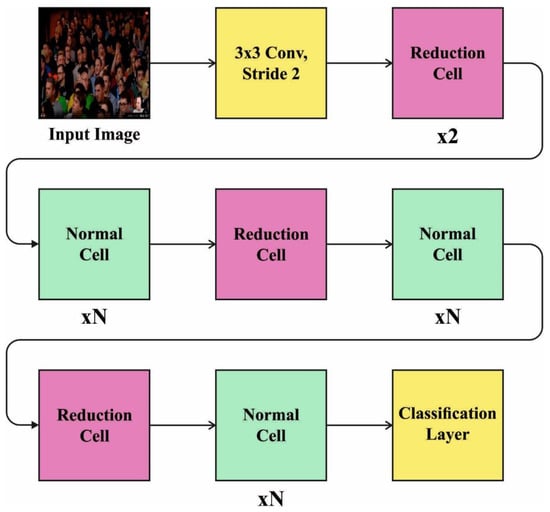 A new searching space was designed, which permits the better architecture found on the CIFAR-10 dataset (available at http://www.cs.toronto.edu/~kriz/cifar.html, accessed on 12 Febuary 2022) that generalized for large, high-resolution image datasets from the range of computation environments. To adapt input of depth of filtering and spatial dimension, this cell is sequentially stacked. In this technique, the convolution net overall architecture is predefined manually. They are composed of convolution cells that possess a similar shape as the original but are weighted in a different way. Two kinds of convolution cells have been taking place for rapidly developing scalable architecture for images of any size: (1) convolution cells return a feature map with a 2-fold reduction in width and height, and (2) convolution cells produce a feature map with the similar dimension. Figure 2 depicts the framework of NasNetLarge.