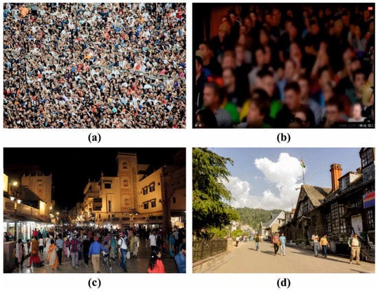Crowd density estimation refers to the assessment of crowd dispersal and the particular number of people [6]. Crowd analysis has attracted substantial interest among researchers in recent years because of various reasons. The massive increase in the global population and in urbanization has resulted in an increase in such events as public demonstrations, sporting events, political rallies, and so on. Similar to other computer vision issues, crowd analysis faces numerous difficulties, such as inter-scene variations in appearance, occlusions, uneven distribution of people, high clutter, intra-scene and scale issues, non-uniform illumination, and an unclear viewpoint; these problems are immensely difficult to solve [7,8]. The perplexity of the issue along with the extensive array of applications for crowd analysis has led to an increased focus among research scholars in recent years.