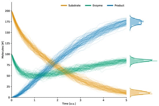 Example of stochastic simulation: 100 independent SSA runs of the MM model—all starting from the same initial state (, and ) and using the same parameterization—lead to quantitatively different trajectories and a final distributions of the chemical species.