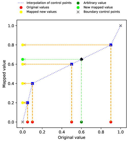 A control point is a couple such that . A DF is defined by a set of control points , where the control points (blue square dots in Figure 2), , are in ascending order (i.e., ) and the points , are called boundary control points (which are represented by gray crosses in Figure 2). The control points map their values into the respective new values according to their definition (such values are represented in Figure 2 by red and yellow points). In order to map any given value of the unitary interval, a linear interpolation between the control points is required. In such a way, the original value is applied to the linear function that interpolates the control points and the point is mapped into the “dilated” value (green points in Figure 2).