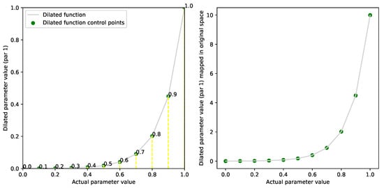 In general, the update rules of the positions of the particles performed in a linear fashion prevent the exploration of such regions. The use of the anti-log DF during the optimization process—and for the initialization of the particles—can overcome this problem by allowing the exploration of the search space in a logarithmic fashion by dilating the regions in the lowest orders of magnitudes. The DF is defined by the control points determined according to Equation (3):