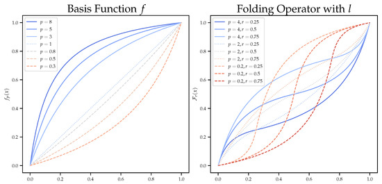 The parameter p () in the first class of BFs determines the magnitude of the distortion applied to the search space with values further from 1 (see Figure 4 on the left). The folding operator is based on a BF , its inverse , and a point , which is the center where the points are moved away or toward (examples of folding operators with different values of r and p are shown in Figure 4 on the right).
