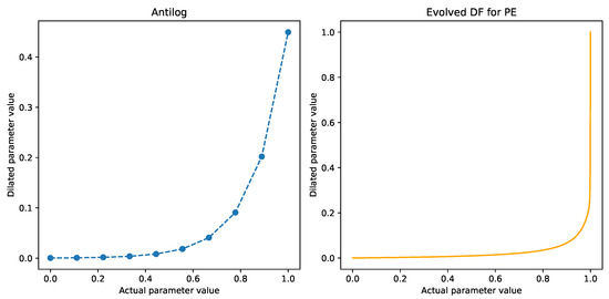 The actual DFs used here—i.e., the anti-log and the evolved one—are shown in Figure 5. It is worth noting that the optimal DF evolved by our approach for the PE of the MM model, despite being “stronger” than the analytical DF, applies a similar dilation to the fitness landscape, i.e., the region corresponding to the lowest orders of magnitude is expanded. To be more specific, the optimal DF obtained for the PE is a composition of three BFs (two out of five BFs were identity functions that can be ignored), as follows: , for all .
