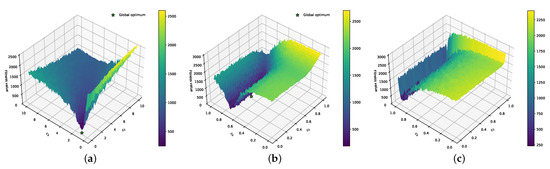 Effect of DFs on the fitness landscape of the MM model. (a) Original fitness landscape. (b) Fitness landscape dilated by means of the analytical anti-log DF. (c) Fitness landscape dilated by means of the optimal evolved DF.