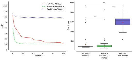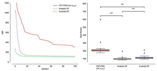 (Left): convergence plot of the PE of the MM model obtained with FST-PSO (no ) (coral solid line), FST-PSO using the analytic DF (green dashed line), and FST-PSO using the evolved DF (blue dotted line). The lines correspond to the ABF calculated over 30 runs. (Right): boxplots representing the distributions of the best solutions found at the end of each run, for each methodology; red dashes denote the mean of the distributions, while diamonds denote the outliers. The asterisks denote the p-values obtained by comparing the distributions by means of the Mann–Whitney U tests ( ** p-value ).