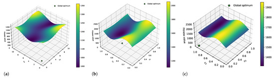 Many works proposed solutions focused on the simplification of the optimization task by exploiting specific transformation functions to re-map the original candidate solutions into a modified search space or by using “smoothed” surrogate fitness landscapes [5]. The manipulation of the fitness landscape can be realized by exploiting the so-called dilation functions (DFs) [6], which can “compress” and “dilate” localized areas of the search space, or other approaches such as the Shrinking Space Technique [7,8,9], which alters the search space to concentrate the search on specific areas, and the Space Transformation Search, [10], which transforms the original search space and simultaneously evaluates the solutions in both the original and transformed spaces. The generation of surrogate models has been shown to be particularly advantageous when algorithms that generally require a huge number of fitness evaluations to converge to the optimal solution—e.g., evolutionary computation and swarm intelligence—are used to tackle the optimization problem. As a matter of fact, the surrogate model is based on an approximated fitness function that can be evaluated with a reduced computational effort [11]. Multi-modal, rugged, and noisy fitness landscapes—such as those typically associated with the PE problem of stochastic biochemical models—can be efficiently tackled with a surrogate modeling method called surF [12], which exploits the discrete Fourier transform. While surF is applied here on the landscape induced by a stochastic model, it can clearly be applied to a deterministic landscape, as carried out, for example, in [12,13]. A peculiarity of surF is that the number of low frequency spectral coefficients used for the inverse Fourier transform can be set to adjust the smoothness of the created surrogate model.
