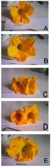 Pumpkin, next to zucchini, melon, and cucumber, belongs to the Cucurbitaceae family and is one of the oldest cultivated plants in the world. All the listed parts of the pumpkin (seeds, fruits, and flowers) are edible and contain nutrients that give them specific health-promoting properties [1,2,3]. Edible flowers are increasingly becoming an integral part of the human diet. They are a good source of antioxidant compounds, which are a very important component of one’s daily diet [4]. The nutritional potential of edible flowers is very high. The health benefits associated with the consumption of edible flowers are believed to be due to the content of natural bioactive compounds with pro-health properties, including phenolic acids; flavonoids; anthocyanins; and other phenolic compounds with proven antioxidant, antimicrobial, and antibacterial properties [5,6,7,8,9]. The use of edible flowers in the kitchen can also be due to the decorative, taste, nutritional, and health-promoting values. They are used in many recipes, both in the decorative form and as an addition to various meals. In gastronomy, we can use the flowers of ornamental plants (e.g., violets, daylilies, magnolias, nasturtiums, and geraniums), flowers of trees and shrubs (e.g., acacia and cherry), flowers of herbs (e.g., lavender, coriander, and sage), and flowers of some vegetables (e.g., zucchini and pumpkin). Flowers are prepared in many ways. They can be both fresh and processed, such as jellies and jams. They can be boiled, fried, grilled, and candied; also, when frozen in ice cubes, they are added to drinks. Edible flowers are also used as an addition to tea, ice cream, sorbets, cocktails, salads, melted cheese, and honey [10,11]. An example of edible flowers that is now more and more often available on the market (also in frozen form) and which has gained great popularity in the food industry is pumpkin flowers [8,11,12,13,14]. Since ancient times, pumpkin flowers have been eaten locally as a vegetable in Mexico and India [13]. There are 27 types of pumpkins, but the most commonly cultivated in Poland is giant pumpkin (Cucurbita maxima L.), pumpkin (Cucurbia pepo L.), and butternut squash (Cucurbita moschata Duch.). The giant pumpkin includes many varieties, for example, Amazonka, Ambar, Atlantic Gigant, and Bambino. Botanical varieties such as cucurbit, zucchini, patison, nakedseeded pumpkin (Miranda), and spaghetti pumpkin belong to the species of pumpkin while Butternut squash, Muscade de Provence, and Rouge vif d’Etampes are among cultivars of squash. Taking into account the plants’ traits, pumpkins are divided into bushy (e.g., courgette, patison, giant Amazon squash) and creeping (most) pumpkin [15].