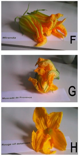 Flowers of various species and varieties of pumpkins: (A)—Amazonka; (B)—Ambar; (C)—Atlantic Giant; (D)—Bambino; (E)—Butternut; (F)—Miranda; (G)—Muscade de Provance; (H)—Rouge vif d’Etampes.