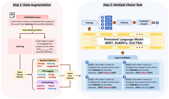 Overall process. The figure on the left corresponds to “Step 1: Data Augmentation” and the figure on the right corresponds to “Step 2: Multiple Choice Task”.