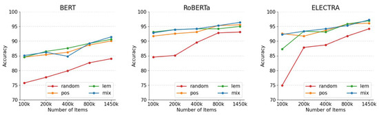 Figure 3 shows that the performance generally tended to improve with the increase in data. This suggests that the proposed augmentation technique is effective in achieving performance. In addition, because of fine-tuning the data obtained by performing POS-tagging and lemmatizing, considering the semantic and grammatical relationships, respectively, the performance was increased compared to the result of training the randomly and brutely augmented data that randomly extracted incorrect answers. Furthermore, Mixed data with both relationships considered exhibited much higher performance. This implies that the performance varies depending on the manner in which the data is augmented even with the same amount of data.