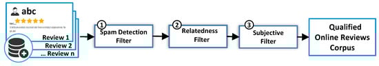 First, the usefulness of online user reviews containing information related to UX and usability from the corpus collection will be identified. Before applying the user review analysis, the framework checks the quality and reliability of user reviews through three user review quality filters: spam detection, relatedness, and subjectivity of review documents. These three classifiers function in a sequential format. They filter spam reviews, access UX-related reviews, and then select the subjective reviews. The relatedness classifier, also known as the UX multi-criteria qualifier (UXMCQ), uses a mainly unsupervised method requiring minimal configuration of domain seed words to auto-label the data based on the context window (see