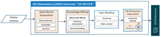 The second step process consists of the following: (i) UX dimensions (UXDs) extraction using the proposed user experience word-embedding LDA (UXWE-LDA), an improved knowledge-based topic modeling methodology, and (ii) sentiment analysis and its orientation for each extracted UXD from online user reviews. UXWE-LDA is an improved LDA version that automatically learns the domain knowledge from the given text corpus. UXWE-LDA resolves the problems of existing LDA, often generating semantically incoherent topics. UXWE-LDA improves the existing knowledge-based topic models by UGC extracting more domain-dependent dimensions in the UX area. UXWE-LDA combines topic modeling, specifically LDA, with word embedding that automatically learns the domain knowledge from a large amount of textual data. This model automatically learns the domain knowledge from the given text corpus and extracts more coherent topics to assign labels as UXD to each extracted topic using a dictionary-based approach. Additionally, it identifies the user’s positive and negative sentiment association towards each UXD. To identify the sentiment orientation, we employed the BERT-based sentiment transformer pipeline.