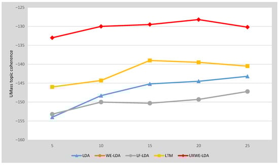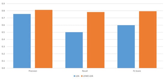 We chose UX experts from a group working with us on an ongoing research project. We performed an extrinsic evaluation by comparing the UXWE-LDA inferred topic with the gold-label topic assigned by the three UX experts. The UX experts annotated a total of 300 online reviews, where each sentence is label based on the provided UX dimension list. Sentences with mutual agreement from all three annotators were considered as gold-label for the performance evaluation. We employed the topic-wise performance metrics (recall, precision, and F1 score) for comparison with LDA baseline algorithms. Precision means the percentage of correct classifications of that topic among all gold-label reviews sets, where the UXWE-LDA model predicts that topic. Recall for a topic is the portion of correct classifications of that topic out of all the cases of that topic in the gold-label reviews. The F1 score of a topic is the harmonic mean of recall and precision of that topic and is given in Equation (