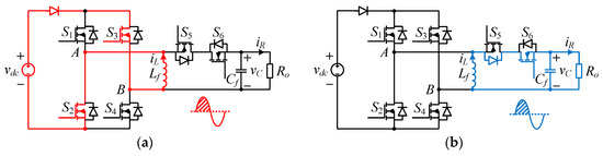 Dc/ac power electronic converters, i.e., inverters, have found widespread applications in the areas of renewable generation [1,2,3,4,5], power conditioning [6,7,8,9], energy storage systems [10], and electric vehicles (EVs) [11,12]. Generally, buck-type inverters, such as the well-known H-bridge inverters, are employed to achieve the objective of dc to ac power conversion [1,2,3,4,5,6,7,8,9,10]. However, due to the inherent voltage step-down characteristic of buck converters [13], the peak ac output voltage for the buck-type inverter should always be lower than its input dc-link voltage. This requirement imposes several limitations on the design and operation of buck-type inverters. For example, in applications where the input dc voltage is equivalent to or lower than the output ac voltage, one additional stage of dc/dc power converter is necessary to boost up the dc-link voltage. Otherwise, the undesirable over modulation of buck-type inverters may occur, which will disrupt the system from normal operation [6].