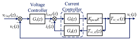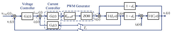 A typical double-loop controller, i.e., an outer voltage-loop and an inner current-loop controller [15,16], is incorporated to regulate the proposed buck–boost inverter. Its relevant control block diagram is shown in Figure 4, where Kpwm denotes the gain of the pulse-width modulator (PWM), z−1 represents one sampling period time delay, and ZOH stands for the mathematical model of the zero-order-hold behavior of the pulse-width generator [7]. It should be mentioned that the proposed controller is implemented by a digital controller, and hence, the transfer functions of the controllers are expressed in the discrete z-domain. In contrast, the system plant model, which is described by (3), is represented in the continuous s-domain. Additionally, a control block denoted as Gd(z) is employed in the current controller to effectively dampen the resonant peak introduced by the LC-filter. Moreover, taking the varying loads into consideration, the load current iR(s) is treated as a disturbance here.