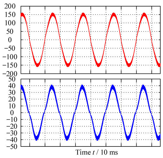 Simulations models were built in Matlab/Simulink software based on the system parameter values listed in Table 1 and the schematic diagram shown in Figure 1. The simulation waveforms of capacitor voltage vc and inductor current iL under two cases, where the peak ac voltages (50 V and 150 V) are lower than and higher than the dc-link voltage, are demonstrated in Figure 7 and Figure 8. For these two cases, the dc-link voltage vdc is maintained as a constant 100 V. As observed, the proposed inverter enables the operations of both buck-type and boost-type inverters. As mentioned, the switching patterns are changed while the system structure remains fixed. These results are consistent with the theoretical analysis.