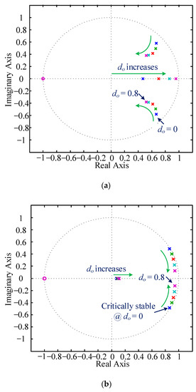 Based on Figure 5 and the system parameter values listed in Table 1, the pole-zero map of the closed-loop voltage control is illustrated in Figure 6, where the zeros are represented as circles while the poles are denoted as crosses. The effectiveness of the proposed damping control block Gd(z) can be clearly observed by comparing Figure 6a,b. As seen, the system poles are located much closer to the center of the unit circle after the carefully designed Gd(z) is enabled. It should be highlighted that the variation in the duty cycle will influence the stability of the proposed inverter, while the stability of conventional H-bridge inverters is independent of do. As a consequence, all the closed-loop poles should always stay within the unit cycle as the duty cycle varies. In order to ensure the system stability, the maximum value of the output voltage vc should be given first, and then the maximum do can be derived according to (8). Next, the variation range of do can be obtained. Finally, the map of the closed-loop poles can be drawn to validate whether the system poles are always inside the unit cycle. As it can be seen from Figure 6a, the system can be stable even when the duty cycle is as high as 0.8, which corresponds to an output voltage of 400 V.