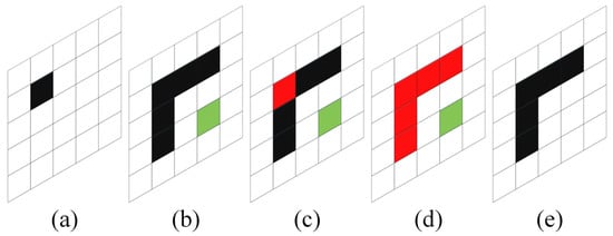 Plot (a) in Figure 3 assumes that the edge detection result is obtained under a high threshold; it can be seen that there are fewer edge points on it. Plot (b) shows the edge detection result obtained in the low-threshold case with more edge points and the appearance of a noise point marked in green. By replicating the edge information in plot (a) to plot (b), plot (c) can be procured. This process is called activation; the activated edge points are marked in red. After that, the activated edge points will activate all the other edge points adjacent to them, as shown in plot (d). Because noise tends to exist in isolation, the isolated noise point is filtered out after the activation process, which is plot (e). The edge information obtained after the detection of this improved algorithm has the characteristics of low noise and high accuracy.