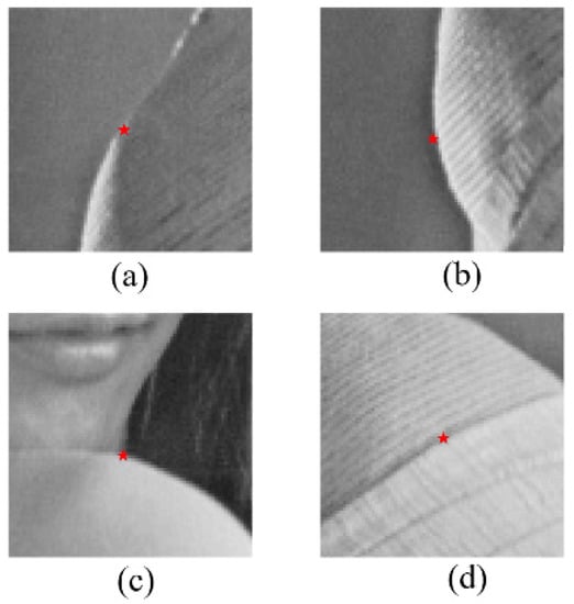 The following figure shows the effect of determining the edge direction of the Lena test image using the gradient determining method in reference [14] and the eight-neighborhood grayscale difference method in this paper, respectively. The results of the gradient determining method for determining the edge directions of the edge points (where the pentagrams are located) in Figure 6a–d are the vertical direction, vertical direction, horizontal direction, and vertical direction, respectively. Accordingly, the edge direction determination results of the eight-neighborhood grayscale difference method are −45° direction, horizontal direction, vertical direction, and −45° direction, respectively. It is thus clear that the determination results of the edge direction by the eight-neighborhood grayscale difference method are more realistic and accurate.