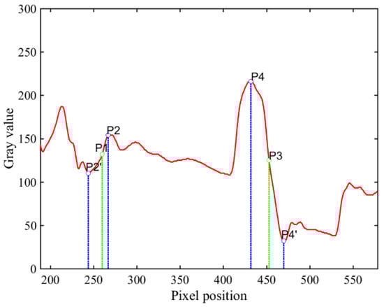 To calculate the edge width of an edge point, it is necessary to find the grayscale extreme points at the two ends closest to the edge point in the edge direction [10]. When the grayscale values of one side are larger than those of the other side, the maximum value point of the side with the larger grayscale values and the minimal value point of the side with the smaller grayscale values are selected as the start and end points of the edge width; the distance between the two end points is the corresponding edge width of the edge point. Figure 8 shows the variation of the grayscale values in the 257th row along the horizontal direction of the reference image “parrots” in the LIVE database [17] after Gaussian blurring. As can be seen in the figure below, the edge widths of the edge points P1 and P3 are P2–P2′ and P4′–P4, respectively.