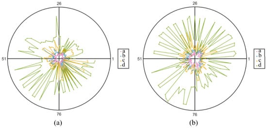 Randomly select 100 edge points of “parrots” and “planes” and divide these 100 points into equal parts by 360° so that each edge point corresponds to an angle within 0–360°, which is the polar angle corresponding to that edge point. Then, the edge width of the edge point is selected as the corresponding polar diameter; so, the edge point with a certain edge width can be mapped to the polar coordinate system. Plot (a) and plot (b) in Figure 10 correspond to the upper and lower rows of images in Figure 9, respectively (each row of images in Figure 9, from left to right, can be numbered as a, b, c, and d). According to the definition of points in the polar coordinate system, the more the line is located outside, the more edge points with large edge widths will be in the image corresponding to the line. It can be clearly seen from Figure 10 that the pink line is the most inward, the blue line is outward, the yellow line is further outward, and the green line is the outermost, which correspond to the fact that the two rows of images in Figure 9 are getting blurred from left to right, indicating that the edge width calculation method proposed in this paper can adequately reflect the blurring degree of images.