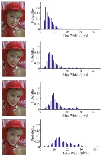 Once the probabilities of different edge widths are obtained, the histogram of the edge width can be established. Take the Gaussian blurred image “womanhat” in the LIVE database as an example; its corresponding histogram is shown in Figure 11.