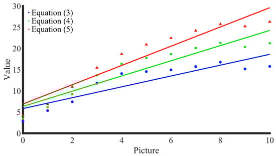 In Figure 17, the blue, green, and red lines are the fitted lines of the scatter points of the image sharpness evaluation values after the introduction of the three distance factors of type 1, type 2, and type 3, respectively. In Table 1, CC is the Pearson linear correlation coefficient and ROCC is the Spearman rank-order correlation coefficient. A higher CC value indicates that the evaluation method is more effective; a larger ROCC values indicates that the evaluation method is more monotonic. From the data in Table 1, it is clear that the evaluation method after introducing the type 3 distance factor performed better in terms of both accuracy and predicted monotonicity. Therefore, when the contents of measured images are the same, the type 3 distance factor performs better.