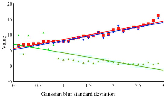 As can be seen in Figure 20, with the increase in the Gaussian blur standard deviation of the images, both the evaluation methods in this paper and reference [14] show an increasing trend while the Tenegrad function evaluation method shows a decreasing trend, which are caused by their respective calculation principles. In order to compare the accuracy of the three evaluation methods more comprehensively, this paper adds a comparison of the root mean square error (RMSE) and mean absolute error (MAE) of the three evaluation methods in addition to the calculation of the Pearson linear correlation coefficient (CC); the final results are shown in Table 2.