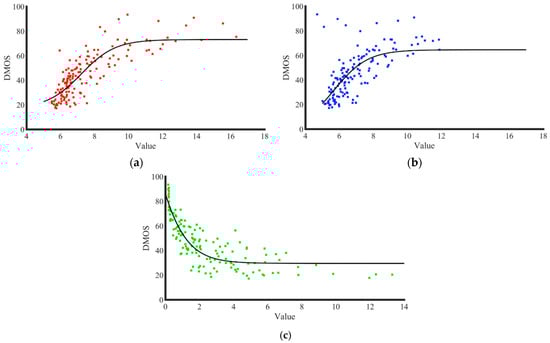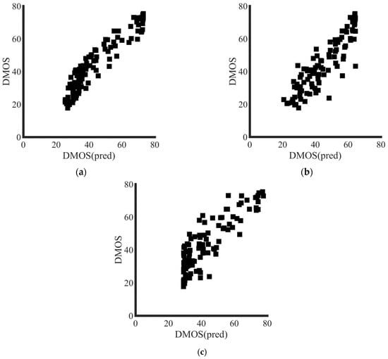 After obtaining the fitted model parameters of the above three methods, the subjective evaluation DMOS values of the Gaussian blurred images in the LIVE database could be predicted by Equation (7). The relationship between the predicted subjective evaluation value and the subjective evaluation value is shown in Figure 22.