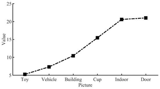 Most of the measured images in the above experiments are from the LIVE database. In order to verify that the sharpness evaluation method proposed in this paper is also effective for real shooting images, we conducted a real shooting experiment by HUAWEI P40 Pro, taking a total of six images with different contents, as shown in Figure 23. The blurring degrees of these six images are increasing sequentially; the sharpness indexes after applying the proposed evaluation method to these images are shown in Figure 24. The experimental result shows that the evaluation method proposed in this paper has the irrelevance of image content and subjective–objective consistency.