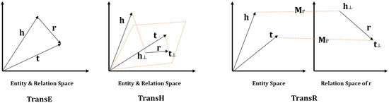 The abovementioned two models assume that entities and relationships are embedded in the same space. However, an entity may have multiple properties, hence there are cases where heads, tails, and relations are not in the same space. To solve this problem, the TransR model was designed. Its basic principle is to divide the whole space into entity and relation spaces. The head and tail nodes in the entity space are mapped to relation space via a relation matrix projection operation by projecting entities from entity space to the corresponding relation space and then building translations between projected entities. Figure 1 shows the entity and relation space of the TransE, TransH, and TransR models.