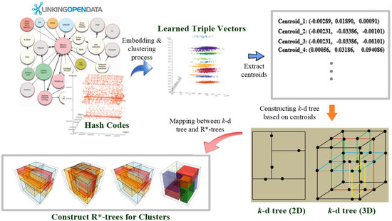 where Sc represents the set of indices of cluster c which contains Nc objects, and a cluster centroid . Finally, R*-trees and a k-d tree are built for the clusters and their centroids, respectively. The main task of k-d tree is to determine the target cluster to reduce data scanning, whereas that of R*-tree is to quickly search the final results within the target cluster. As all data items in LOD are represented in triples of the form <subject, predicate, object>, the LOD cloud uses the RDF2Vec graph-embedding technique. Before RDF2Vec graph-embedding processing, however, the LOD datasets need to be preprocessed because these datasets are represented in the triple format. To perform RDF2Vec graph-embedding operations, Apache Jena [25] under the OpenKE [26] platform is employed to parse and sequence raw data. Figure 3 describes the overall architecture of our index structure schematically.