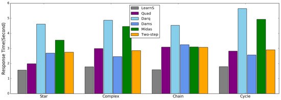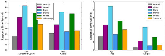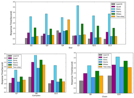 Figure 5 shows the join query performance on the LinkedGeoData dataset. In this figure, join query types only focus on the most common star, complex, chain, and cycle types. This figure shows that experimental results for LinkedGeoData are almost identical to the experimental results for LUBM. Under the LUBM dataset, the join query performance of the LearnS, Dams, and Two-step approaches achieved better results than those of the other methods. Similarly, under the LinkedGeoData dataset, the query performance of LearnS always beat the performance of other methods. However, the performance gap between LearnS and Two-step was particularly prominent in the chain type.