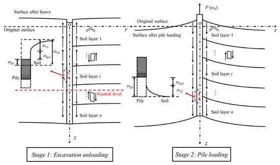 During the pile loading stage, a tension load is applied on the pile head, and the pile will move upward. The positive shaft resistance above the neutral level will change to negative shaft resistance, and the negative shaft resistance below the neutral level will increase. Consequently, the neutral level will move upward and disappear during the loading stage, and negative shaft resistance will develop along with the pile. The relative displacement at pile–soil interface is equal to the pile displacement plus pile–soil relative displacement at the excavation unloading stage minus shear-induced soil displacement and residual pile–soil relative displacement caused by excavation unloading:
