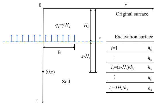 Figure 2 shows the schematic of the greenfield soil heave calculation. The source of bottom soil heave is excavation unloading due to removal of soil. Thus, the weight of excavated soil is applied upward at the excavation surface to calculate the soil heave. Considering the excavation depth, the Mindlin solution is adopted to calculate the unloading stress of soil with different depths. The unloading stress at depth is given by:
