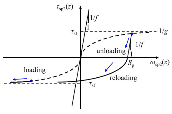 The load-transfer behavior between pile and soil in the pile loading stage is more complicated than that in the excavation unloading stage. Figure 4 shows the load-transfer curve in the pile loading stage. The negative shaft resistance below the neutral level increases with increasing applied load. In contrast, positive shaft resistance above the neutral level decreases to zero and becomes a negative value. The variation of positive shaft resistance above the neutral level resembles the unloading and reloading processes. During the unloading process, it is reasonably assumed that the pile–soil relative displacement is elastic. The positive shaft resistance decreases linearly with the slope equal to the initial tangent stiffness of the original load-transfer curve . Only the elastic pile–soil relative displacement can be recovered in the unloading process, and the residual pile–soil relative displacement exists before reloading. The load-transfer curve in the reloading process is similar to the original load-transfer curve with the same fully mobilized shaft resistance . A piecewise function can determine the residual pile–soil relative displacement :