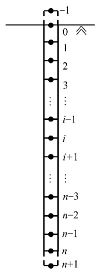 By solving Equation (6), the pile response after excavation can be obtained. However, Equation (6) is a nonlinear second-order differential equation, and it is hard to obtain an analytical solution. Therefore, the load-transfer method combined with numerical difference is adopted in this paper. Firstly, the pile was discretized into segments to facilitate the numerical analysis, as shown in Figure 5. The length of each segment is . The nodes of each segment are numbered from the top to the base of the pile. Two virtual nodes, numbered -1 and n+1, are added to create boundary conditions. When is large enough, linear axial force distribution can be assumed to simplify the analysis. In the excavation unloading stage, substituting Equation (1) into Equation (6), the load transfer differential equation of a single pile can be rewritten into: