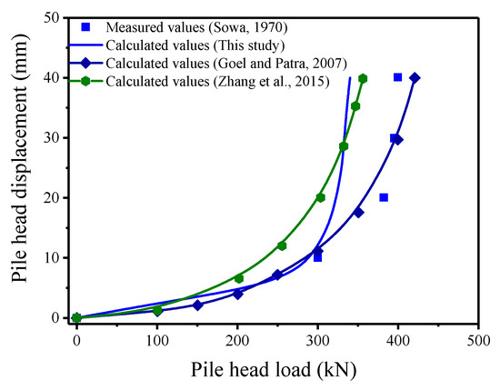 To validate the proposed method, well-documented case histories were used. The results from the proposed method were compared with the data extracted from the case histories. The first two cases were pile load tests without excavation effects. The validations were conducted by executing steps 7 to 12 in Section 4.2 with the soil and pile parameters from the original papers. The pile–soil relative displacements were zero before loading. In cases three and four, the pile load-displacement curves before and after excavation were calculated using the proposed approach. For the pile load-displacement behavior before excavation, the calculation process is the same as that of cases one and two. For the pile load-displacement behavior after excavation, the validations were conducted by executing steps 1 to 12 in Section 4.2 with the soil, pile, and excavation parameters from the original papers.