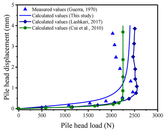 Figure 7 shows a comparison between the calculated load-displacement curve and the measured load-displacement curve. The calculated results from Lashkari [22] and Cui et al. [37] are also presented in Figure 7. In Figure 7, it can be seen that the calculated load-displacement curve is generally consistent with the measurements and the calculated results of Lashkari [22] and Cui et al. [37]. When the load is less than 2000 N, the proposed approach underestimates the load, while the approaches of Lashkari [22] and Cui et al. [37] overestimate the load. When the load is larger than 2000 N, the proposed approach and approaches of Lashkari [22] and Cui et al. [37] overestimate the loads.