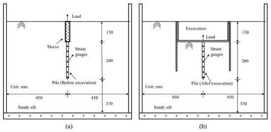Li et al. [15] carried out centrifugal tests to investigate the uplift pile behavior change before and after excavation. Two aluminum hollow model piles were uplifted before and after excavation, as shown in Figure 8. The length, width, and height of the model box are 900 mm, 700 mm, and 700 mm, respectively. The length of the pile is 330 mm, with an outer diameter of 10 mm and a thickness of 2 mm. The centrifugal tests were conducted with an acceleration of 100 g. Thus, the excavation depth and diameter were 13 m and 30 m, respectively. The sandy silt collected from the changing island was used in the centrifugal tests. The physical and mechanical properties of sandy silt are summarized in Table 2. Two uplift pile load tests were carried out. For the uplift pile load test before excavation, the load test was carried out at the ground surface. The shaft resistance within the excavation depth was eliminated by a sleeve (Figure 8). For the uplift pile load test after excavation, the load test was carried out at final excavation surface.