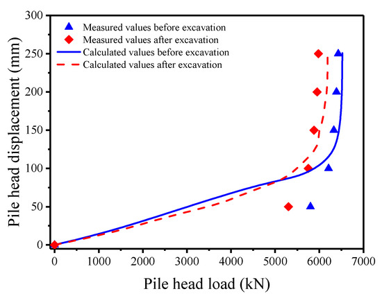 Figure 9 shows a comparison between the tested and calculated pile load-displacement curve. When the load is less than 6000 kN, the proposed approach underestimates the load, while the proposed approach performed well in predicting pile load-displacement curves when the load is larger than 6000 kN. In the original paper, the soil shear modulus was not presented, and the constrained modulus was used in the proposed approach. Using the constrained modulus underestimates the initial stiffness of the pile–soil interface. Hence, the proposed approach underestimates the load when the load is less than 6000 kN. The ultimate bearing capacity of the uplift piles before and after excavation is 6210 kN and 5750 kN, respectively. Hence, the ultimate bearing capacity of the uplift piles was reduced by 7.4%, with an excavation depth of 13 m.