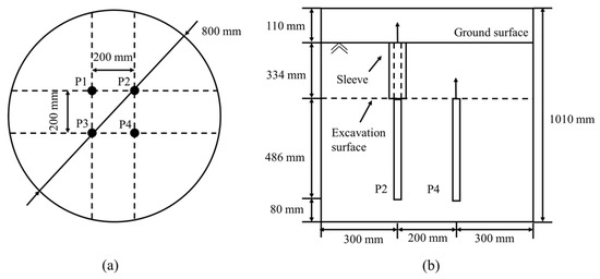 Another centrifuge test was conducted to validate the proposed approach [38]. The centrifuge test was conducted with an acceleration of 100 g. A sketch of the centrifuge tests is shown in Figure 10. A circular excavation was modeled. The model box was a circular stainless box with a diameter of 800 mm and a height of 1010 mm, respectively. Four piles were used in the test. The aluminum piles, P1 and P2, were uplifted before excavation. The shaft resistance within the excavation depth was eliminated by a sleeve. Another two aluminum piles, P3 and P4, were uplifted after excavation of 334 mm. The diameter of the pile was 8 mm, and the effective length of the pile was 486 mm. The effective length was defined as the pile length below the excavation surface.
