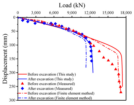 Figure 11 shows a comparison of the load-displacement curves obtained by the centrifuge test and the proposed approach. Only the test results of piles P2 and P3 are presented, due to the symmetry. The numerical simulations conducted by Hu et al. [38] are also presented in this figure. It can be seen in the figure that the proposed approach performed well in predicting the load-displacement curves before and after excavation. The pile uplift capacity before and after excavation was 17,000 kN and 12,000 kN, respectively, showing a 29% capacity loss caused by the excavation.