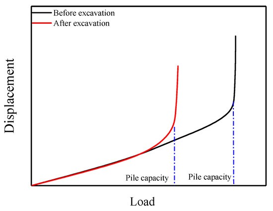 In engineering applications, piles are often installed before basement and tunnel excavation, especially when using the bottom-up excavation method. Conventionally, the pile load-displacement behavior is evaluated by means of a load test conducted at the ground surface before excavation. Although the shaft resistance within the excavation depth is eliminated by the sleeve, the load test still overestimates the pile capacity due to the stress relief and excavation disturbance. Additionally, excavation beneath a pile-supported building to add basement space has become popular [11]. The bearing features of the pile after a new excavation are different from those before a new excavation [12]. The reasons for the change in pile load-displacement behavior after excavation are stress relief and heave-induced tension. Stress relief decreases the pile capacity and stiffness. Troughton and Platis [13] reported that the base resistance of a pile after excavation decreased by 20%, with a vertical effective stress reduction of 50%. Zheng et al. [14] found that the reduction in the pile capacity could be up to 45% with increasing excavation depth normalized by pile length. For piles under uplift load, Li et al. [15] found that the uplift capacity of the pile decreased by 9.84% with an excavation of 13 m. Tension force develops in a pile after excavation due to soil heave [16]. As the tension force develops, the shaft resistance is mobilized, and the shear stiffness at the interface decreases. Thus, the pile stiffness decreases due to the initial pile–soil slip.